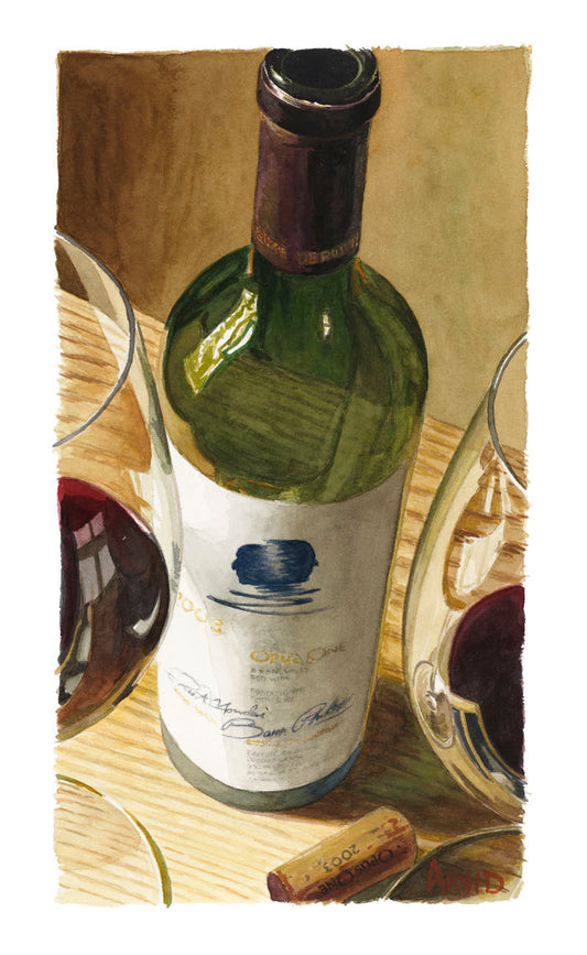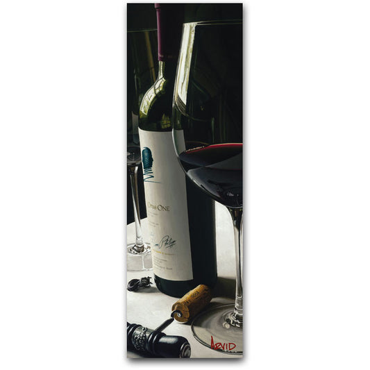 Arvid developed his style after a few trips to the vineyards in Napa, California where he discovered that most artists painted vineyards and grape clusters. No one captured the ambiance of family and friends enjoying wine so the self-taught artist came up with a style that poses a bottle of wine, glasses, the cork and sometimes a corkscrew – all in a natural setting viewed from a natural angle. “I like to paint it just as you see it on a table or counter, not from eye level,” he says.