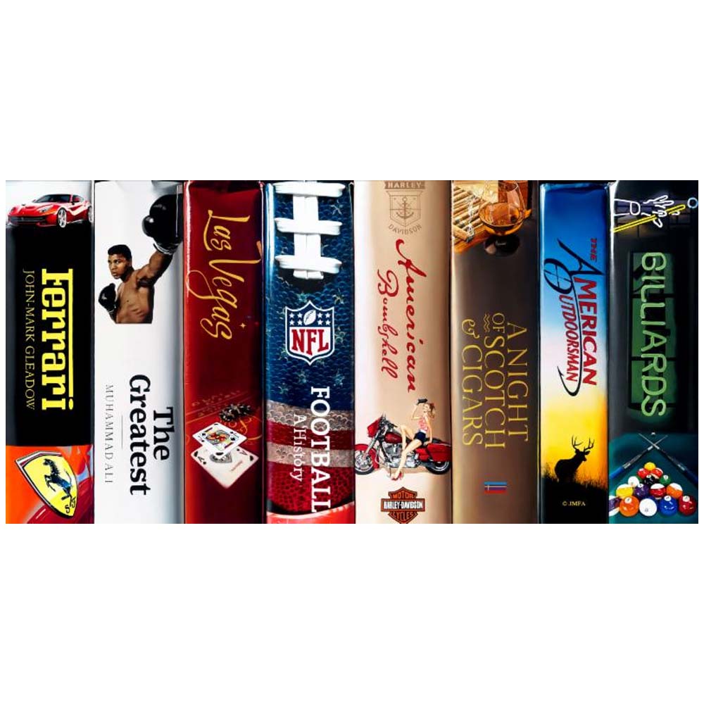 Beginning with still lifes, John-Mark’s paintings soon came to have portraiture as their backbone. With his mastery of the medium his trademark use of vibrant colors has come to the fore – an element of his work made the more fascinating due to his having to cope with his own colorblindness. His most recent series has fused the centuries old theme of painting book spines with his love of doing figurative work and has allowed him to broaden the thematic horizons of his paintings. “The wonderful thing about working in this vain is how limitless the subject matter can be and how it makes for a logical way of juxtaposing entirely different topics, producing a work of art that’s beautiful as a whole, not just aesthetically, but thematically as well.”