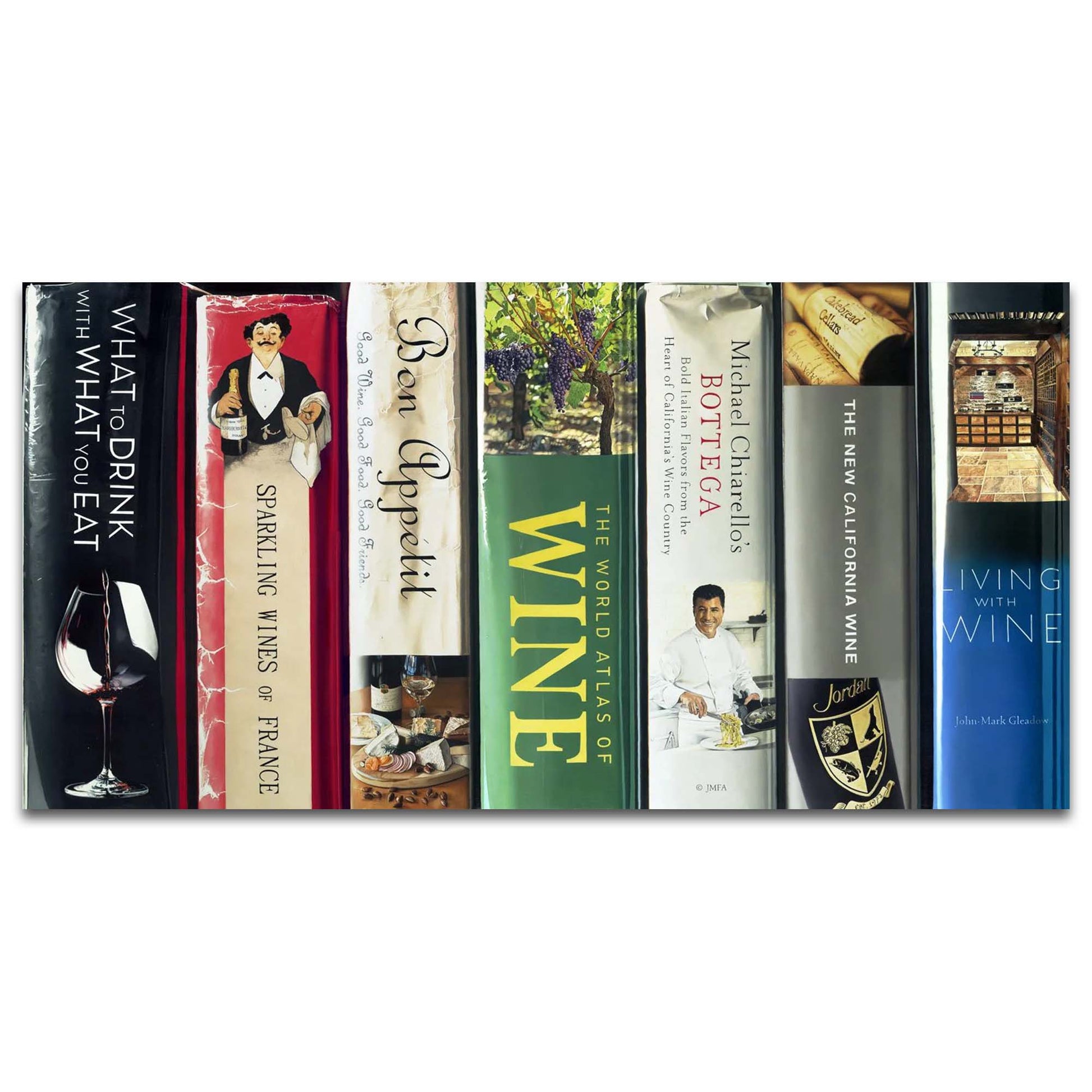 “New Wine” offers a richly textured toast to the world of wine and conviviality, wrapped in Gleadow’s trademark hyper-real bookshelf motif. In this captivating piece, the artist transforms the spines of wine-themed books—titles that evoke tasting rooms, vineyards, and celebratory gatherings—into a still-life composition that feels both elegant and approachable. With vivid detail and striking clarity, each “book spine” is rendered as though it might be pulled forward, its lettering crisp and its colors deep.