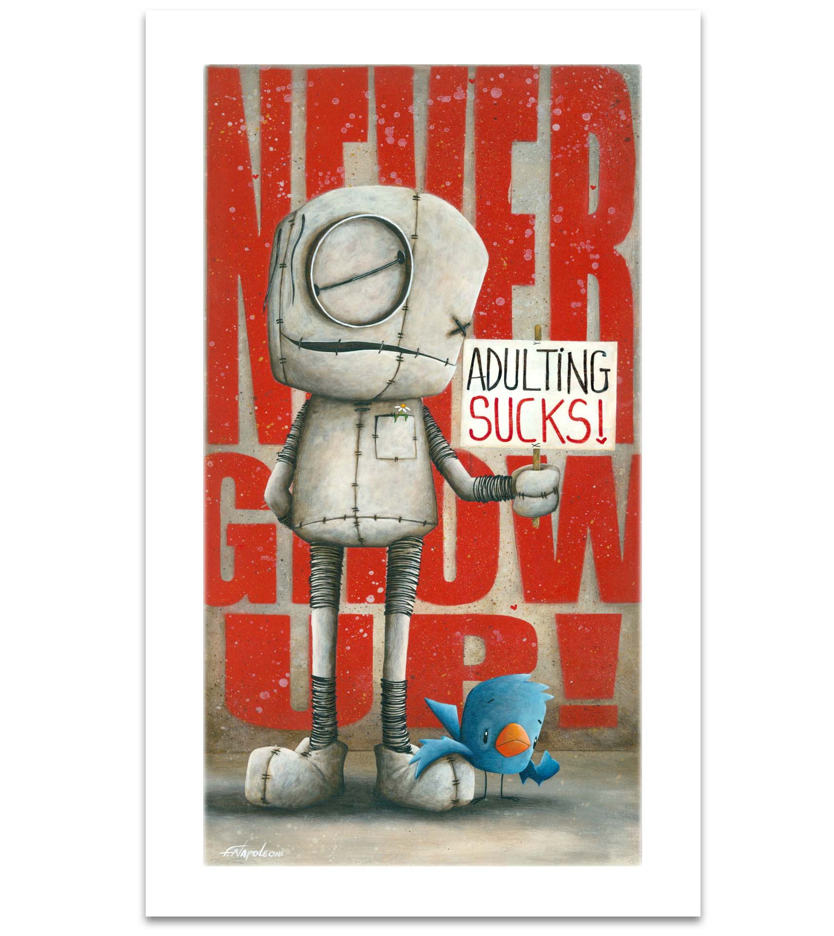 Adulting Sucks! Never Grow Up ... "The base for this image came from a request made from a long time collector. The older we get the more often we drift off and look back at our childhood or early teen years with far more fondness than at the moment we lived them in. The hours spent carelessly wondering, clueless to our surroundings and most of all the lack of responsibilities is something we can’t afford to do as adults but gladly would relish in them for a few hours if given the opportunity." -Fabio Napoleoni